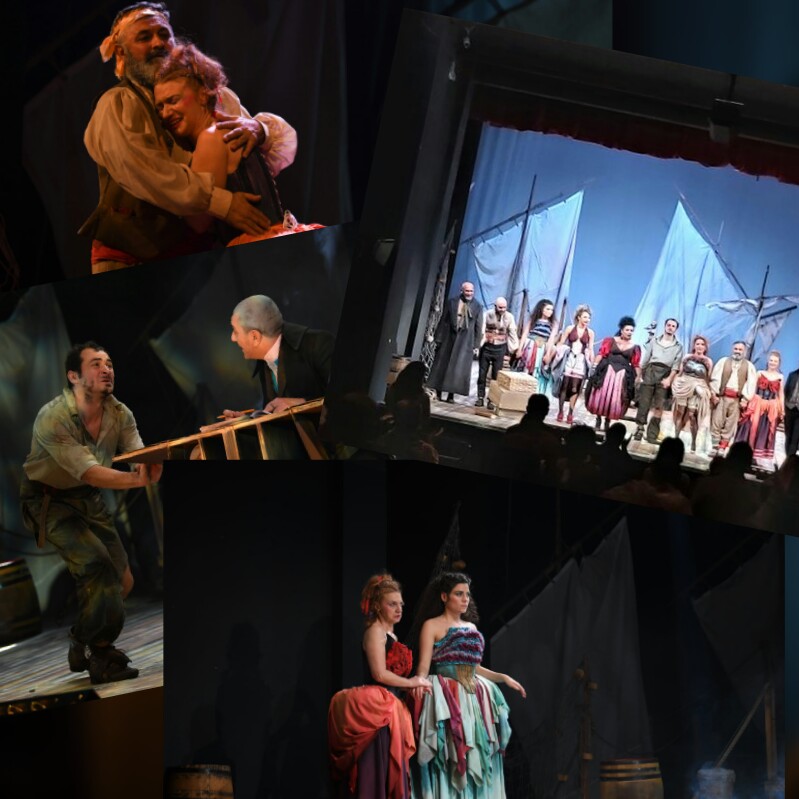 Scenograful Mihai Androne crează un decor maritim. Nu lipsesc corabia, valurile, pânzele, frânghiile, lăzile cu pește, construcțiile sărăcăcioase.Costumele (realizator Maria-Alexandra Ivan și asistentele Andreea Burlacu si Diana Neacșu) nu sunt doar niște haine de epocă. Ele au seva comediei dell arte, dar și o undă de modern strident sugerând o senzualitate mocnită. Cele feminine accentuează temperamentele temperamentalelor neveste și iubite de pescari, îmbină elemente din haine de curtezană cu cele de amazoană și precupeață gureșă. Cele masculine sunt lejere, sugerează virilitate primitivă, un destin arhaic și îmbibat în tradiție .