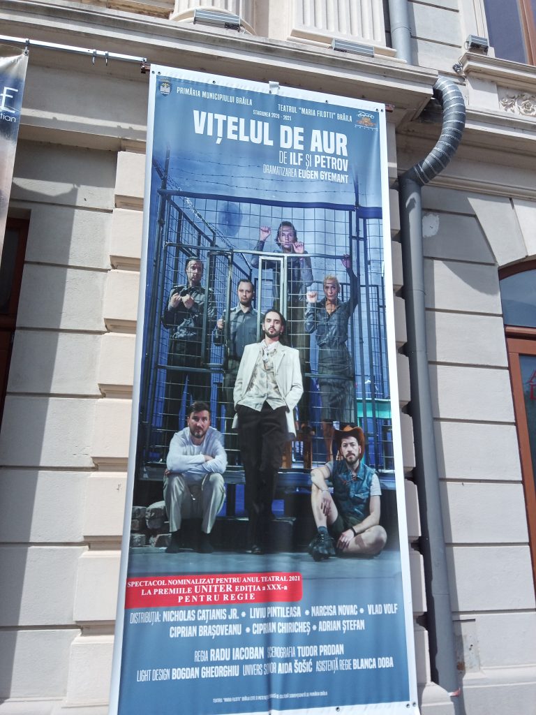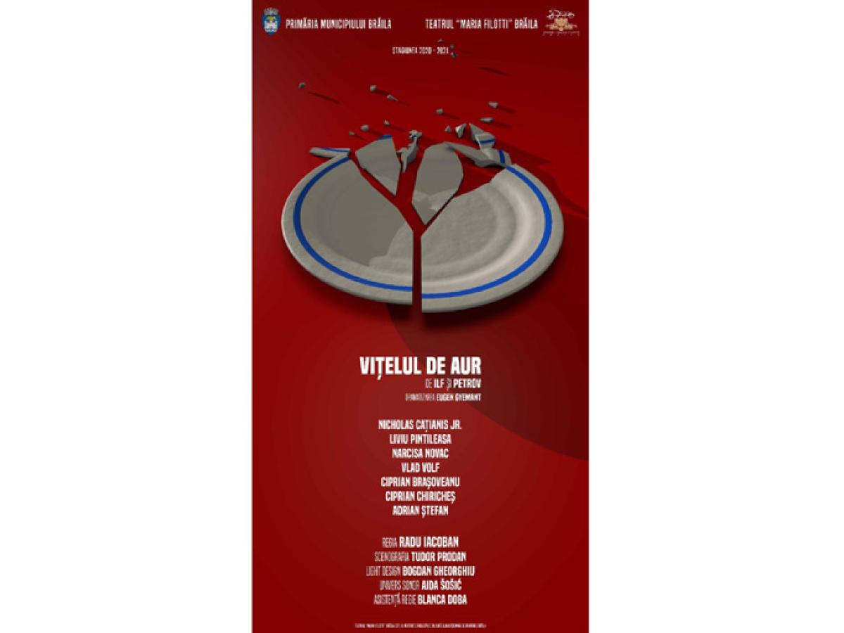 Vitelul de aur este, alături de Douasprezece scaune, capodopera lui Ilf si Petrov, o parbolă sarastică despre dictatură, absurd ce prezintă  povestea lui Ostap Bender in birocratica și corupta Uniune Sovietică de la Arbatov la Cernomorsk, apoi pe șantierul feroviar transsiberian, ajungând în Moldova. Dramatizarea lui Eugen Gyemant comprimă povestea, reduce numărul de personaje și menține acele întâmplări sugestive pentru tulburările unei societăți schizoide în care entuziasmul tâmp al clasei proletare nu se suprapune peste intențiile noii conduceri. Pregătindu-se a deveni suflete moarte, personajele piesei sunt puse sub lupa necruțătoare a analizei psihologice executată cu un umor macabru. Toți sunt gata a-și vinde sufletul.Dedublările comportamentale ale celor care alcătuiau sistemul, alienarea ca formă de supraviețuire, atitudinile uneori în  dezacord cu limbajul şi gestica oficiale, alteori conformiste până la sațietate, arbitrarul, mizeria generalizată, cenușiul rutinei zilnice, înghețarea în spaime și stereotipii, nimic, dar absolut nimic nu anunță crearea OMULUI NOU. Bender (Nicholas Cațianis) este un însingurat care se teme de singurătate, poate de aici înfrățirea sa cu alți doi copii a locotenentului Schmidt”, Shura Balaganov(Vlad Volf), hoț în formare și Mikhail Panikovsky(Liviu Pintileasa), un hoț ramolit, cu iz de clown bătrân, , un “călcător de conveţii”.