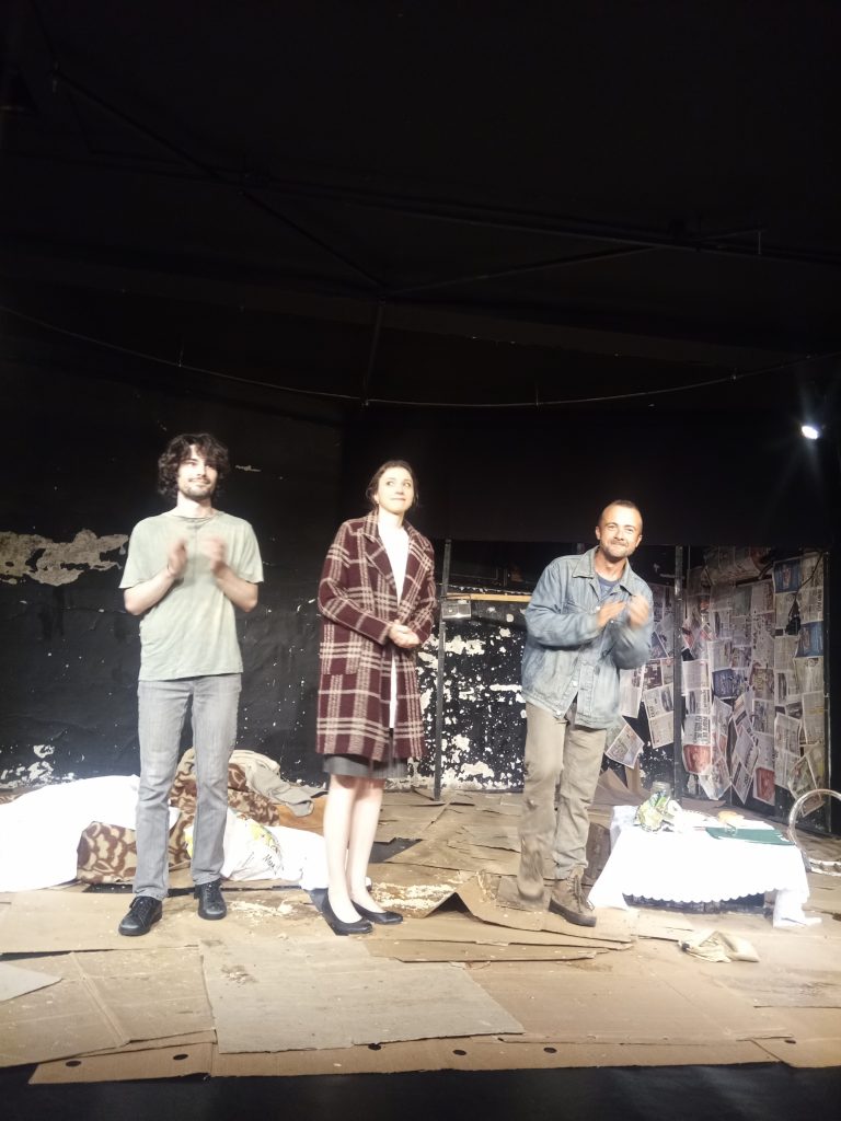 George Constantinescu…greu de descris jocul său, sau mai degrabă inutilă descrierea unei partituri căreia numai un nebun i-ar găsi cusur. La intrarea în scenă de nerecunoscut printr-o mimică de ins abrutizat. Clipiri șirete ale ochilor cu iz de șmecherie de mahala și cu un duh al răului infiltrat în orice privire. Fără tușe groase, dar îmbătându-se atât de veridic sub ochii noștri, cât să simți că pe scenă sigur miroase a vodcă. Vocea împleticită pe tonalități joase, tremurul mâinilor cu unghii jegoase. Gesturi vulgare, aparent nevinovate, glumițe cu înțeles dublu, o infecție purulentă de imoralitate și minciună sub pavăza unui umor dezgustător de băiat de gașcă. Neostentativ, dar de un realism crunt, dezinvolt, fără a scăpa de sub control vreun gest sau vreun ton incongruent cu personajul său, jocul lui George Constantinescu îți taie pur și simplu respirația.