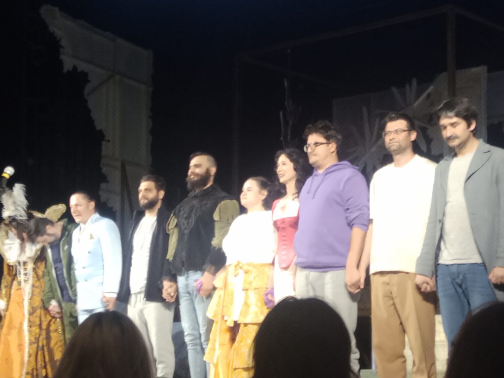 Actorii din Galați  sunt o trupă omogenă, vie, mișcătoare, se vede, se simte că lucreazămult împreună, fiecare se integrează bine în ansamblu, fără a-și pierde individualitatea. Fiecare întruchipează câte o tipologie, cu ciudățeniile, defectele și calitățile sale.”Eu” și”Noi” se leagă și se dezleagă făcând ca spectacolul să crească de la o scenă la alta, în ritm direct proporțional cu emoția spectatorului care uită subiectul propriu-zis al piesei, văzând în față doar niște oameni  care au în ei un munte de nebunie, o mare de entuziasm, un cer de iubire pentru limba română și teatru. Ionuț Moldoveanu, căruia imobilitatea nu îi răpește omiprezența scenică este nostalgicul evocator al „pe vremea mea” în doze potrivite de ironie, Răzvan Clopoțel- Anton și toporul / baltagul său este tăcutul și introvertitul om de pază, Ștefan Forir, introvertit și firav este studentul Boncu la  filozofie dornic de iubire. De-a ridicolul și de-a infatuarea se joacă Cristina Uja Neagu- doamna Mase și Cristian Gheorghe,  directorul trupei. Cu visul de a deveni cunoscut cochetează Vlad Ajder, Idieru. Mereu în posturi nepotrivite, mai mereu cu idei nepotrivite, Boian, sufleorul ce se închipuie actor se regăsește în Florin Toma. Roluri în game comice cu inflexiuni de tandrețe reușesc Oana Mogoș ( Domnișoara Marghiolița ) și Elena Anghel ( Domnișoara Homiceanu ). Radu Horghidan devine regizorul-povestitorul-actorul locomotivă, („Sunt eu, Radu Horghidan, m-ați recunoscut?”). Toate celelalte personaje se mișcă la bagheta sa, are șarm, aplomb, este ancorat în realitate, dar și vizionar. Fără stridențe, cu stângăcii studiate, cu un timbru vocal constant, Radu îți cucerește inima prin zbaterea sa profundă în numele unui ideal neînțeles pe deplin.
