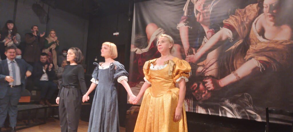 Nu, nu știam cine este Artemisia Gentileschi. Nu citisem nimic înainte, lăsând la garderobă haina spectatorului premium. Era ultimul spectacol al anului, voiam să fiu surprinsă, să alunec într-o poveste neștiută, având drept garanți ai calității spațiul exclusivist al Teatrului Act, regia lui Alexandru Mâzgăreanu, meșter în a lustrui bijuterii artistice în locuri intime, numele celor trei actrițe pe care le văzusem jucând mult atât în teatrul de stat, cât și în cel independent. Doar că nu a fost o simplă poveste! Ceea ce s-a petrecut pe scenă a activat toate dimensiunile mele, nu numai aceea de spectator. Pe scaunul de spectator, lângă mine s-au așezat juristul, mama, omul cetății, iubitorul de artă, profesionista ce s-a forțat să răzbească într-o lume în genere masculină. Fiecare din aceste „personaje” și-a pus o întrebare, a găsit un răspuns, a iubit sau a urât unul din personajele poveștii. Într-o oră jumătate de teatru, cu respirația oprită, cu toți analizatorii la pândă am trăit nu doar în Roma anului 1612, ci în toate timpurile și locurile în care se comit violuri, abuzuri, crime, unde justiția este sora geamănă a injustiției, unde prezumția de nevinovăție are picioare fragile gata mereu să se frângă, iar victima rămâne pe veci îngenuncheată în fața persecutorului.